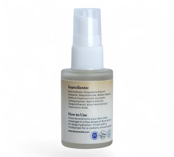 Achieve brighter, hydrated, and balanced skin with Bano Herbal Rice Serum. Enriched with Niacinamide, it helps reduce dark spots and control oil, while Hyaluronic Acid deeply hydrates for a plump, smooth complexion. Zinc soothes irritation and promotes a clear, healthy glow. Perfect for all skin types.