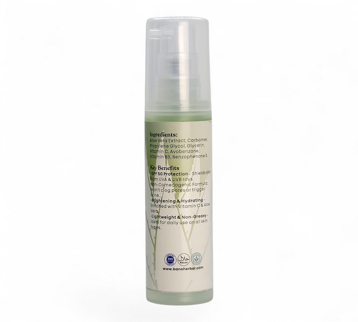 Protect and brighten your skin with Bano Herbal Glow Up Sunscreen Gel SPF 50. Specially designed for oily and acne-prone skin, this lightweight, non-comedogenic formula shields against UV damage without clogging pores or causing breakouts. Enriched with organic ingredients like Aloe Vera, Vitamin C, and Vitamin B3, it soothes, hydrates, and enhances your natural glow keeping you protected and confident all day.